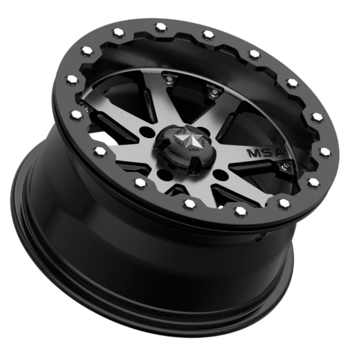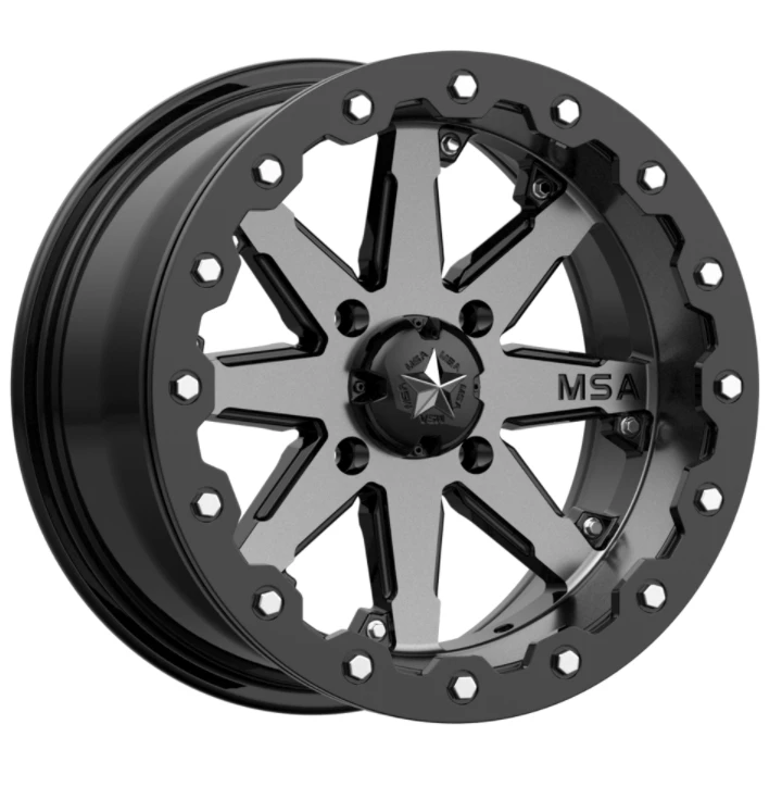 The M21 Lok is beauty, function and performance all engineered to push your machine to the next level. Each M21 Lok wheel comes with all of the necessary parts to professionally lock any tire to your wheels, ensuring a safe and quality ride. What makes this beadlock UTV wheel different from the rest is because of a couple unique MSA attributes. The finish we used on this wheel is a gunmetal, which is actually a dark tinted clear-coat that is overlaid on top of the micro-machined wheel face. The Gunmetal finish is accented with gloss black automotive grade paint, only offered by MSA. The unique M21 Lok wheel design sheds weight, dirt, mud and debris fast, making clean up a snap. Racer proven, ride ready. Backed by a full lifetime structural warranty, you bend it or break it, we replace it. Â